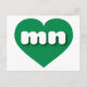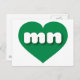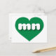 Esta postal cuenta con un corazón verde y ecológico que contiene las letras fundas negrita, blanca, redondeada y baja, una abreviatura lúdica para Minnesota, el estado de la estrella del norte. El reverso de la postal está en blanco, esperando el texto personalizado o los sentimientos manuscritos.