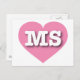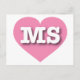 Esta postal tiene un vibrante corazón rosado que contiene las letras negrita, blanca y alta del funda MS, la abreviatura oficial de Misisipi, el estado de magnolia. El lado inverso de la postal está en blanco, a la espera de tus sentimientos escritos a mano o de tu texto personalizado.
