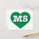 Esta postal cuenta con un vibrante corazón verde ecológico que contiene las letras negrita, blanca y alta del funda MS, la abreviatura oficial de Misisipi, el estado de Magnolia. El lado inverso de la postal está en blanco, a la espera de tus sentimientos escritos a mano o de tu texto personalizado.