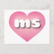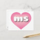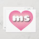 Esta postal tiene un corazón rosado con un centro lavado de blanco que contiene las letras negrita, blanca y funda inferior ms, una versión juguetona de la abreviatura de Misisipi, el estado de la magnolia. El reverso de la postal está en blanco, esperando el texto personalizado y los sentimientos escritos a mano.