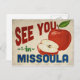 Una encantadora postal de viaje vintage de Missoula Montana con una hermosa manzana roja, junto con un divertido texto de estilo retro que dice, "Nos vemos en Missoula"