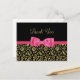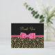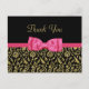 Una moda negra y dorada damasco floral gracias postal con un arco de satén rosa caliente de moda. Personalice este elegante diseño añadiendo un mensaje personal. Imagen plana impresa, no con arco metálico o real.
