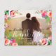 Coloca dos fotos en tus tarjetas de agradecimiento boda, una en la parte delantera y otra en la parte trasera. Envíe su mensaje de agradecimiento a su boda como recién casados a sus amigos y familia usando esta hermosa y simple tarjeta postal de fotos de boda floral de agradecimiento con las palabras "gracias" escritas en un guión escrito con letras blancas sobre el fondo. Boda Gracias Postales con Tu Foto. Diseño de Elke Clarke© . Reemplace las fotos de ejemplo con las suyas. Añade tu mensaje de agradecimiento personal en la parte de atrás o deja en blanco y escribe tu mensaje en persona a mano. Hay otros colores disponibles.