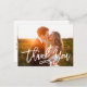 Elegante boda gracias por publicar una plantilla de tarjeta con una foto en el frente y en la parte posterior, "Gracias" con un moderno tipo de letra de escritura blanca, y mensaje de agradecimiento de texto personalizado.