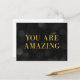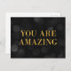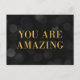Postal motivacional de moda con las palabras "Eres asombroso" en falso Relieve metalizado de oro contra un oscuro fondo de patrón de luces de bokeh. Para agregar texto a la tarjeta, haga clic en el botón "Personalizar". *Tenga en cuenta que la marca de agua Zazzle que aparece en la vista previa del zoom NO aparecerá en el producto impreso final. © Rosewood y Citrus