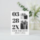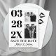 Modern black and white two photo gay Save the Date postcard. It showcases the date in black typography in a column and two photos of the couple. The phrase "Save the Date" is in script style typography. The black features two black tuxedo along with your text.