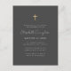 Composed of cursive script and serif typography; All against a backdrop of white background. A simple faux gold cross subtly decors the typography. This is a modern, simple and clean funeral or memorial invitation.