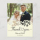 This picture is a wedding thank you card featuring a photograph of a couple, with decorative elements and text.