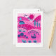 This notecard features a vibrant, stylized landscape with a whimsical and modern aesthetic. It uses a rich color palette of deep blues, vibrant pinks, and purples to create a layered, multi-dimensional scene with imaginative details, including flying fish, birds, a small sailboat, and a stylized house nestled in the hills under a pink sun. Contrast colors that give it a playful, yet sophisticated feel.