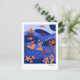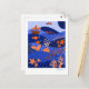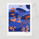 This notecard features a vibrant, stylized seascape with a whimsical and modern aesthetic. It uses a rich color palette of deep blues and orange an to create a layered, multi-dimensional scene with imaginative details, including flying fish, birds, a small sailboat, and coral reefs. The design is characterized by clean lines and high-contrast colors that give it a playful yet sophisticated feel.