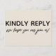 En el texto editable se colocó la "respuesta amable", grande y atrevida, en el frente. En una moderna escritura informal, a continuación aparece un gráfico que representa "¡esperamos que puedan unirse a nosotros!". En la parte posterior, se utilizó el mismo tipo de letra único para crear gráficos que dijeran "rsvp", "m" y "amablemente entregar a:" y todo el resto del texto es editable. Utilice los campos de plantilla para personalizar todo lo que desee. El frente tiene un fondo elegante que se puede cambiar a cualquier color que prefiera. // 100 //