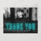 Moderna graduación gracias postales mostrando la foto horizontal del graduado con "Gracias" en letras de neón cian. Personalice la foto graduada gracias a la tarjeta postal añadiendo el nombre del graduado, el nombre de la escuela y el año de graduación. La foto de graduación gracias a que la postal se revierte para mostrar su dirección de retorno y tipeó un mensaje de agradecimiento (dejar en blanco para escribir a mano la propia).
