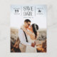 De este modo, la tarjeta de fecha guarda una fotografía de página completa con un titular único de Save the Date que incorpora la fecha de boda, los nombres de la pareja y la ubicación del boda en un diseño divertido y moderno. La parte posterior de la tarjeta de fecha de guardado se configura como postal y está lista para enviar por correo.