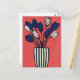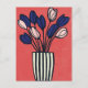 Los pétalos de cobalto audaces florecen sobre un jarrón de rayas rosas, que evoca un humor lúdico de mediados de siglo sobre una base de coral suave.