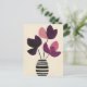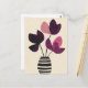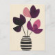 Los pétalos ricos de ciruela se elevan en un jarrón de rayas crema con contornos gruesos sobre un delicado fondo de chicha amarillo, suave pero gráfico.