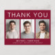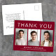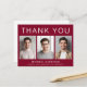 Tarjeta de agradecimiento de graduación de color rojo burdeos moderno con 3 fotos del graduado y "Gracias", el nombre del graduado, escuela y año de graduación en tipografía blanca simple. Personalice su mensaje de agradecimiento en la parte posterior y agregue su nombre con una escritura similar a una firma.