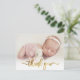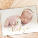 Elegante Caligrafía Moderna Guión Dorado Foto De Recién Nacidos Bebé Gracias Postcard. Presenta un hermoso texto de "gracias" en una caligrafía escrita a mano con un tipo de letra cruz cruda en el Relieve metalizado de oro FAUX. Al revés, un mensaje personal prefabricado en blanco y negro. Fácil de personalizar con la foto y los detalles de su bebé.