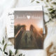 Moderna caligrafía de escritura de pincel minimalista Guardar la postal Date que es totalmente personalizable frontal y posterior. Tus nombres con letras a mano con un corazón lindo rodeados por tu foto favorita y tipografía de moda. Más información sobre el gran día en la parte de atrás junto a su dirección de retorno, espacio para su sitio web boda y nombres completos. Esta es la versión con letras blancas.