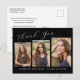 Esta moderna tarjeta postal de agradecimiento de graduación de 3 fotos, presenta elementos de diseño de texto moderno fusionados con elegante escritura en caligrafía. Tus fotos de graduado se muestran en la parte delantera de la tarjeta mientras que la parte trasera ofrece espacio de texto personalizado para un mensaje de agradecimiento o se puede dejar en blanco si deseas escribir tu mensaje a mano. Los fondos son negro y blanco regios o se pueden personalizar fácilmente a los colores de tu elección.