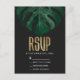Elegante, moderna y sencilla playa de color verde agua tropical suizo queso monstera hoja sobre fondo negro con falsos impresos tipografía de Relieve metalizado dorado verano RSVP Postales. Este diseño clásico y sofisticado es perfecto para cualquier evento elegante y de moda, incluyendo bodas y ocasiones diarias. Personalice con su propio mensaje en la parte delantera, así como un monograma inicial personalizado en la parte posterior. Todo el diseño de impresión fotográfica.