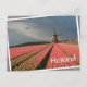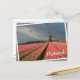 Postal de un paisaje con molino de viento y tulipanes rosados en filas en una granja de bombillas bajo un cielo gris en el campo en los Países Bajos en primavera con un borde blanco y en blanco el texto 'Holanda'. La foto está un poco rotada para crear la ilusión de que se suelta.