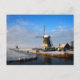 Foto postal de un molino de viento junto a un pequeño río a la luz del sol de una fría mañana de invierno en un paisaje campestre holandés con nieve en los Países Bajos.