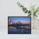 Postal de dos molinos de viento iluminados y un puente levadizo con reflexión en el agua del canal en la última luz al atardecer en Kinderdijk en los Países Bajos con un borde negro y el texto: 'Países Bajos'.