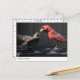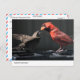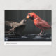 Esta cautivadora postal cuenta con una impresionante fotografía que capta un momento íntimo entre un cardenal rojo vibrante y un gorrión pardo. Los dos pájaros están encaramados en lo que parece ser una superficie negra, y el cardenal aparentemente ofrece o comparte comida con el gorrión. El contraste de los colores, la rareza de esas interacciones pacíficas con la avidez y el foco fresco hacen que esta imagen sea fascinante y reconfortante, perfecta para los aficionados a las aves o como una nota para enviar a sus seres queridos.
