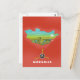 Mapa ilustrado mongol, paisaje y poster turístico de vacaciones en la hoja de un avión de apoyo contra un vívido fondo rojo.