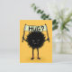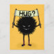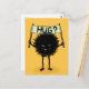 Una gran postal con un monstruo malvado adorable - un personaje peludo sonriente de la familia del Mal Flor. Lleva un cartel con el mundo escrito a mano "¿Abrazo?". Esta criatura rara amigable tiene calcetines lindos y sin mangas solamente para mantener sus pies calientes en este mundo poco amigable.