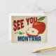 Una encantadora postal de viaje vintage de Montana con una hermosa manzana roja, junto con un divertido texto de estilo retro que dice, "Nos vemos en Montana"