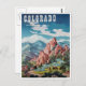 Escena de Colorado de la vieja publicidad de viajes vintage con "Colorado" en la parte superior en una fuente occidental. La colorida imagen muestra montañas, árboles, gente a caballo y una formación rocosa como el Jardín de los Dioses.