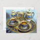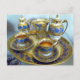 Una bandeja dorada y azul para el café con tazas y platillos color oro y azul, jarras de café y leche y accesorios a juego