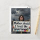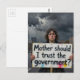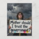 A surreal scene with a woman holding a sign that asks Mother should I trust the government?