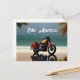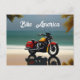 Una bonita motocicleta está aparcada en una playa bajo un cielo azul turbio.