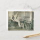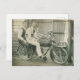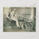 Esta postal muestra una fotografía vintage de los años 30 de dos hombres, un niño y un oso de peluche posando en una motocicleta.