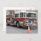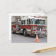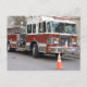 Fotografía de un camión de bomberos rojo brillante estacionado justo fuera de la escena del incendio