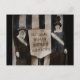 Dos mujeres del movimiento sufragio posan al lado de un cartel con bandera como telón de fondo.