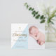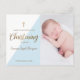 Personalice la foto de su bebé y su nombre completo. Esta elegante tarjeta postal de agradecimiento a Christening facilita el envío de tu gratitud. El guión y cruz dorado impreso "Christening" añade un toque de elegancia a este diseño moderno. El azul puede cambiarse con la herramienta adicional del personalizar, contacta conmigo en info@lddesignloft.com si necesitas ayuda.