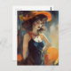 Una hermosa mujer usa un vestido negro con correas naranjas y un gorra naranja en una pintura temática de otoño