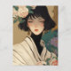 Una bella morena con una elegante bata lleva flores en el pelo.