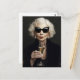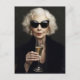 Una sofisticada mujer mayor con rizos de platino, gafas de sol oscuras, joyas lujosas y un abrigo de piel negra, sosteniendo elegantemente una copa de champán.