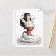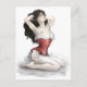Una mujer de cabello oscuro con un corsé rojo y medias blancas golpea una clásica pose chica.