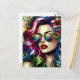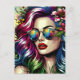 Arte de Guay ai que representa a una colorida bonito de estilo cómico visitando la ciudad con flores en el pelo. Pelo rosa, púrpura, verde y azul, gafas de sol reflexivas arte digital.