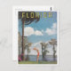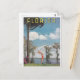 Hermoso ilustracion publicitario vintage de los años 1030 en Florida muestra a una mujer con traje de baño frente a una vía fluvial con palmeras y cielo azul.