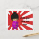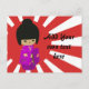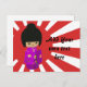 Postal Muñeca Kawaii Kokeshi rosada sobre el sol naciente