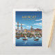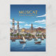 Una vibrante pintura acuática representa el icónico horizonte de Mascate con minaretes y cúpulas, situado sobre un telón de fondo de montañas y un mar tranquilo salpicado de dhows.