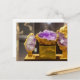 La asombrosa postal presenta una imagen fotográfica generada por IA de un hermoso trío de geodésicos de cristal amatista en pedestales de oro como si se mostrara en un museo