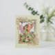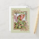 arte vintage con pintura de hadas de una bella dama de fama cubierta de trébol y con grandes alas de mariposa rosa tocando un arpa dorada como pequeñas hadas chicas y adornos de leprechaun con abrigos verdes y sombreros de cabeza negra bailando en círculo.