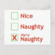 Tres casillas de verificación verdes con las palabras Niza, traviesa y Muy traviesa en rojo al lado, la caja para Muy traviesa ha sido marcada con una "X" ¡perdón Santa!